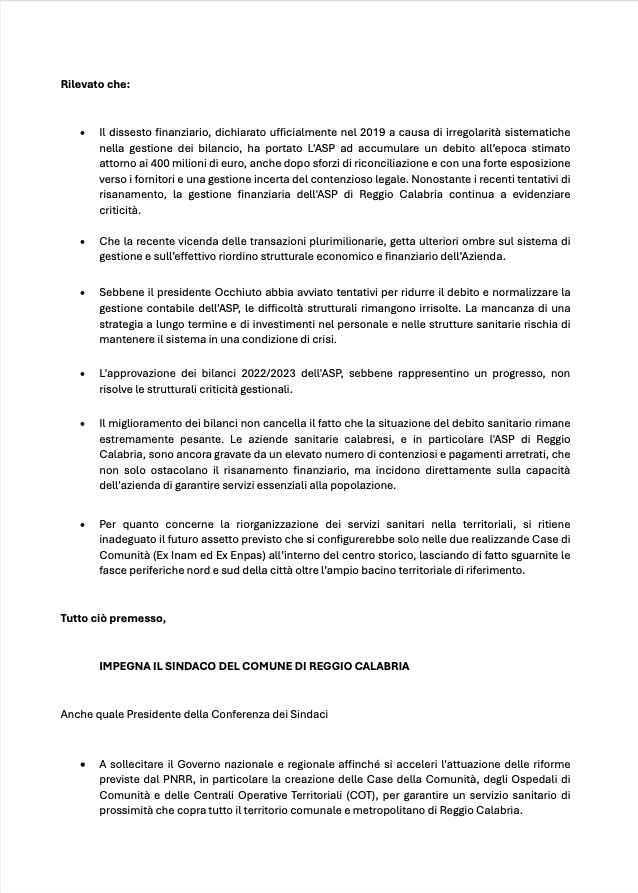 Il problema non è di strutture e locali ma di personale; e se il problema è che la nostra regione non è economicamente attrattiva allora la questione seria è quella degli investimenti; ma, a proposito di investimenti, Falcomatà chiede conto del perché la Regione non abbia ancora fatto partire i lavori per il GOM con investimenti impegnati per 270mln di euro: 3 volte il Museo del Mare e 4 il Palazzo di Giustizia. Il sindaco chiude ricordando che dopo l’emergenza covid era stato assunto l’impegno ad aumentare i posti di terapia intensiva; anche questo poi disatteso.
