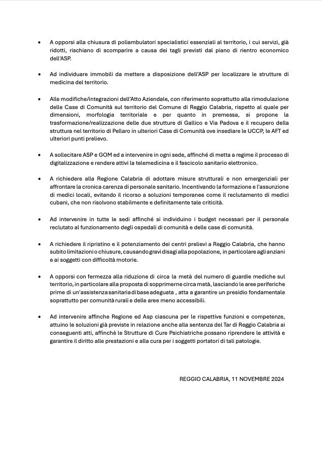 Ciò detto, pur registrando e rilevando gli aspetti positivi di quanto rapportato dalla Di Furia e da Scaffidi, Falcomatà non esprime soddisfazione in totopretendendo delle risposte concrete rispetto alla paventata chiusura di guardie mediche o altri presìdi di prossimità; cita espressamente la questione del polo sanitario in via padova che non può e non deve chiudere “a favore di” un altro perché i servizi vanno implementati ed una nuova apertura (vedi ipotesi poliambulatorio di Pellaro dove il Comune ha messo a disposizione dell’ASP il Centro Civico) non può escludere ed annullare quanto già esiste e risulta essere indispensabile per quelle aree cittadine e le loro peculiarità.
