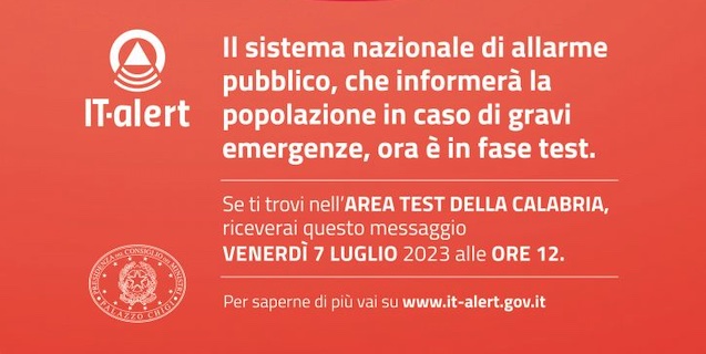 Il Settore Protezione Civile della Città Metropolitana comunica che il prossimo venerdì 7 luglio alle ore 12.00 è previsto il test di sperimentazione del sistema It-alert, il nuovo sistema di allarme pubblico che servirà ad avvertire la popolazione di una determinata area geografica di un’emergenza climatica in arrivo o una catastrofe naturale in corso, per il quale la Calabria risulta regione capofila, insieme a Sicilia, Toscana, Sardegna ed Emilia Romagna, nella sperimentazione organizzata dal dipartimento nazionale di Protezione Civile di It-alert.