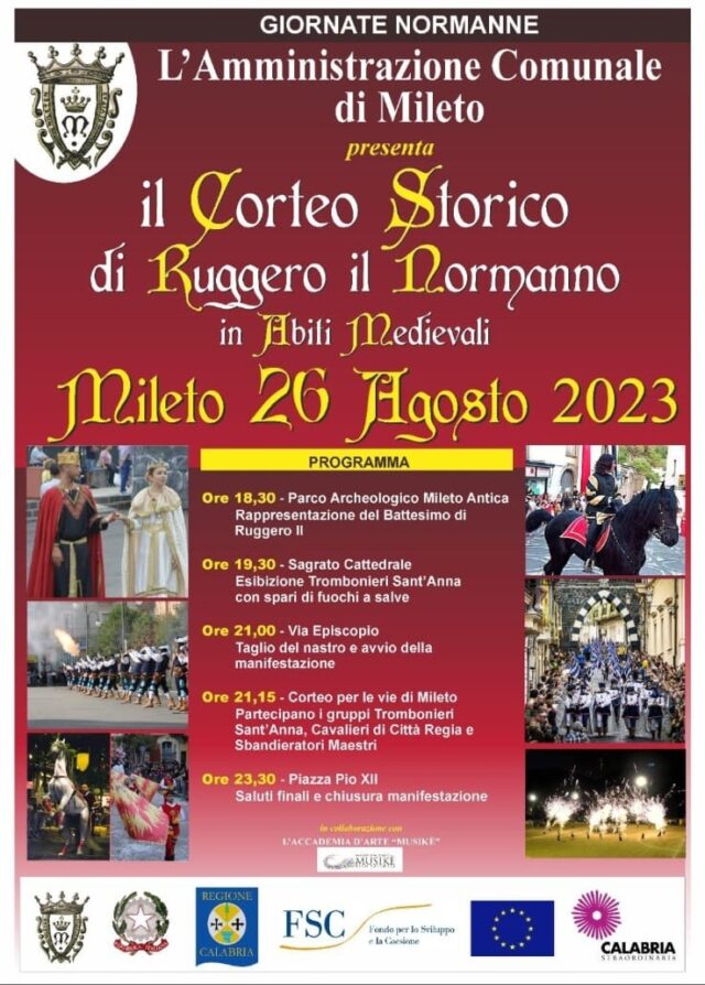 (73) L’Amministrazione Comunale di Mileto nell’ambito delle “Giornate Normanne”, iniziative finanziate con il contributo della Regione Calabria – Calabria Straordinaria, propone per Sabato 26 Agosto, il Corteo Storico Normanno e la rievocazione storica di alcuni eventi legati alla figura del Conte Ruggero I D’Altavilla,
