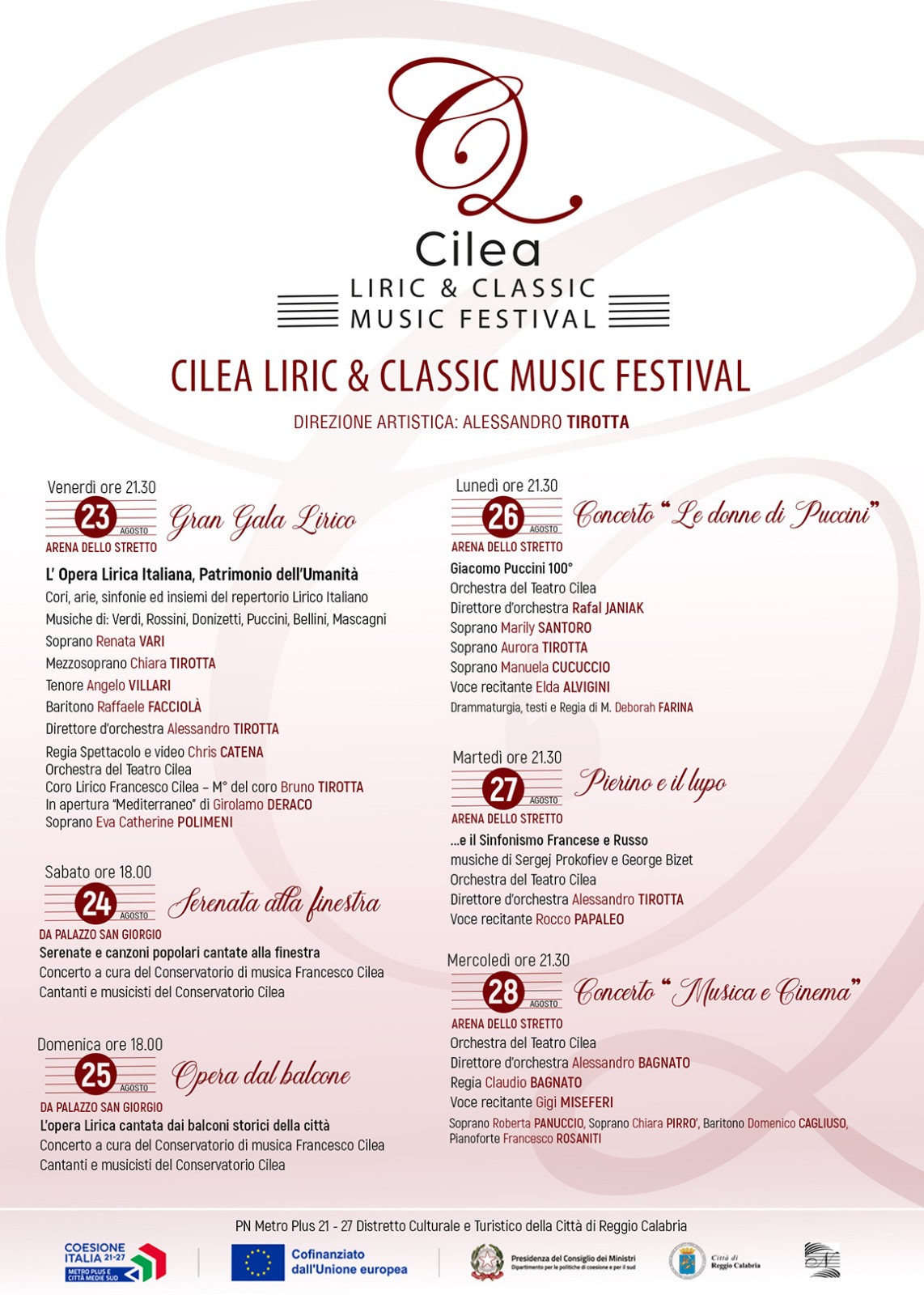 La rassegna, curata dalla direzione artistica di Alessandro Tirotta, si avvale del contributo dell’orchestra e coro lirico del Teatro Cilea e del Conservatorio di Reggio Calabria, e numerosi cantanti e musicisti di grande livello, tra cui molti calabresi. Il programma prevede l’apertura il 23 agosto all’Arena dello Stretto, sul lungomare Italo Falcomatà, con il Gran galà lirico, con cori, arie, sinfonie ed insiemi del repertorio lirico italiano, Patrimonio dell’Umanità. Le musiche saranno di Verdi, Rossini, Donizetti, Puccini, Bellini, Mascagni. Sabato 24 agosto la rassegna si trasferirà a Palazzo San Giorgio, sul Corso Garibaldi, per lo spettacolo ‘Serenata alla finestra’, a partire dalle 18:00, con un concerto di serenate e canzoni popolari cantate alla finestra, a cura del Conservatorio Cilea. Domenica 25 agosto sempre da Palazzo San Giorgio, alle 18:00, sarà la volta dello spettacolo ‘Opera al balcone’, concerto sempre a cura del Conservatorio Cilea, con brani di opera lirica cantate dai balconi storici della città. Il 26 agosto, il Festival tornerà all’Arena dello Stretto per il concerto ‘Le donne di Puccini’, alle 21:30, realizzato in onore del grande compositori italiano a 100 anni dalla sua scomparsa. Martedì 27 agosto, alle 21:30, sarà la volta di ‘Pierino e il lupo’ e il sinfonismo francese e russo, lo spettacolo si avvale della voce narrante dell’attore Rocco Papaleo. Martedì 28 agosto il gran finale, alle 21:30 si terrà il concerto, sempre apprezzato, ‘Musiche da film’, a cura dell’orchestra del Teatro Cilea e voce narrante dell’attore e cabarettista reggino, Gigi Miseferi.