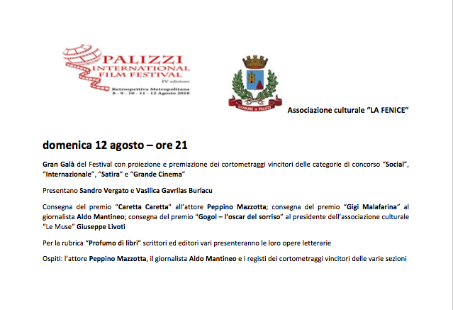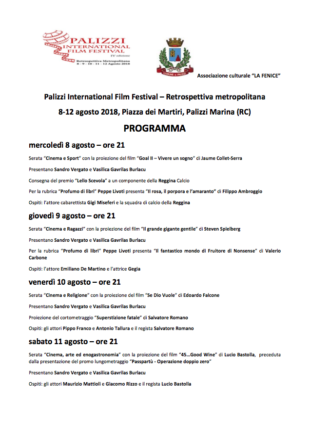 (572) Dall’8 al 12 agosto a Piazza dei Martiri. Ospiti di prestigio si alterneranno a proiezioni cinematografiche altamente qualitative. Il premio “Caretta Caretta” all’attore Peppino Mazzotta. Spazio anche alla Reggina calcio, alla rubrica “Profumo di libri” e alla new entry del concorso cinematografico. Si accendono le luci dei riflettori sul “Palizzi International Film Festival – Retrospettiva metropolitana”, tradizionale appuntamento dell’estate reggina giunto quest’anno alla IV edizione. Dall’8 al 12 agosto sarà il suggestivo scenario di Piazza dei Martiri ad ospitare l’attesa kermesse cinematografica organizzata dall’associazione culturale “La Fenice” di Stefano Baldrini e fortemente voluta dal sindaco di Palizzi Walter Scerbo. Il tutto con la partnership del Parco Nazionale d’Aspromonte e la direzione artistica di Giacomo Battaglia, i cui noti problemi di salute gli impediranno di essere presente in terra ionica. Sarà la sorella Angela a farne le veci, con l’auspicio di rivedere nuovamente il popolare e amatissimo artista reggino nell’edizione del 2019. Tante le novità del Piff 2018, a cominciare dalle serate tematiche “Cinema e Sport” (8 agosto), “Cinema e Ragazzi” (9 agosto), “Cinema e Religione” (10 agosto), “Cinema, arte e enogastronomia” (11 agosto), nel corso delle quali saranno proiettati rispettivamente i film “Goal II – Vivere un sogno” di Jaume Collet-Serra, “Il grande gigante gentile” di Steven Spielberg, “Se Dio vuole” di Edoardo Falcone e “45… Good Wine” di Lucio Bastolla. Spazio anche a giovani registi e filmmaker (12 agosto), che avranno la possibilità di esaltare il loro talento artistico attraverso un concorso cinematografico articolato in tre categorie competitive (“Social”, “Internazionale” e “Satira”) e una non competitiva (“Grande cinema”). Tantissimi gli ospiti che sfileranno sul red carpet della cittadina ionica. Fra questi gli attori Maurizio Mattioli, Giacomo Rizzo, Pippo Franco, Gegia, Antonio Tallura, Emiliano De Martino e i registi Lucio Bastolla e Salvatore Romano. Particolarmente significativa nella serata di esordio del Festival sarà la presenza di Gigi Miseferi, che con Giacomo Battaglia lo scorso anno ha celebrato proprio durante il Piff i 30 anni di duo “Battaglia & Miseferi”. “Clou” della manifestazione la consegna del premio “Caretta Caretta”, creato dal maestro orafo Gerardo Sacco in onore della tartaruga marina che depone le uova sulla spiaggia di Palizzi. Ad esserne insignito sarà l’attore cosentino Peppino Mazzotta, protagonista del film “Anime nere” e della fiction di Rai 1 “Il commissario Montalbano. In palinsesto anche il premio giornalistico “Gigi Malafarina” al caposervizio di “Gazzetta del Sud” Aldo Mantineo, il premio “Gogol – l’oscar del sorriso” al presidente dell’associazione culturale “Le Muse” Giuseppe Livoti, il premio “Lello Scevola” a un componente della Reggina Calcio. E proprio la squadra amaranto al completo sarà protagonista l’8 agosto con la presentazione al pubblico ionico. Spazio anche alla cultura con l’apprezzata rubrica “Profumo di libri” curata da Angela Battaglia e Peppe Livoti, con una serie di autori che di sera in sera presenteranno le loro opere letterarie. Nelle vesti di presentatore ci sarà l’attore comico catanese Sandro Vergato, grande amico di Giacomo Battaglia, che ha accettato con entusiasmo il ruolo propostogli. Ad affiancarlo l’attrice rumena Vasilica Gavrilas Burlacu, già nota al pubblico di Palizzi per aver presentato alcune serate della passata edizione. Il Piff 2018 si accinge dunque a riaprire i battenti. Cinque serata da vivere tutte d’un fiato per gli appassionati di cinema e per tutti coloro che, in queste calde serate estive, vorranno godere di uno spettacolo piacevole e aggregante.