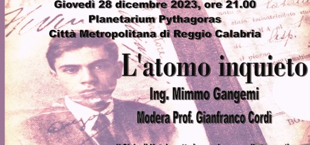 (576) Il 28 Dicembre alle ore 21,00 al Planetarium metropolitano Pythagoras l’ingegnere Mimmo Gangemi autore del libro “l’Atomo inquieto” e Gianfranco Cordì, epistemologo, filosofo nuovo Continue reading “Città Metropolitana di Reggio Calabria: domani al Planetarium metropolitano Pythagoras si indaga sulla scomparsa di Ettore Majorana – IL REGGINO” →