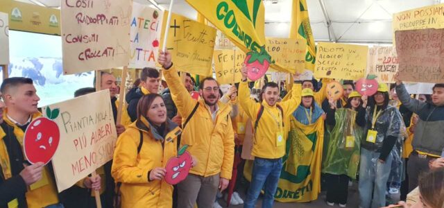 (9) Nella giornata nazionale della frutta è iniziata al Villaggio Coldiretti contadino di Cosenza la protesta dei giovani della Coldiretti per fermare l’abbattimento delle piante che sta provocando la desertificazione dei territori con drammatici effetti sui consumi nazionali e sul clima, l’ambiente, e la salute degli italiani.