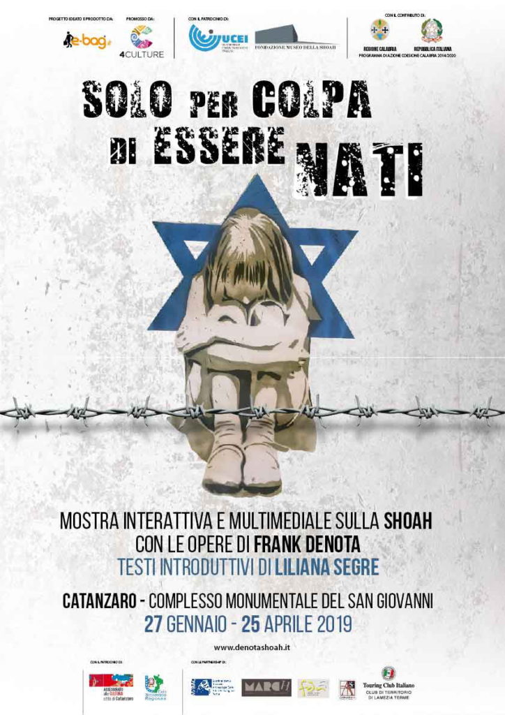 (29) Solo per colpa dì essere nati è un progetto culturale inedito, promosso dalla 4culture Srls in collaborazione con E-bag Srl. Gode del sostegno della Regione Calabria grazie ad un contributo rivolto al supporto di iniziative culturali di grande rilievo, del patrocinio dell’UCEI – Unione delle Comunità Ebraiche Italiane, della Fondazione Museo della Shoah di Roma, del’Ufficio Scolastico Regionale per la Calabria e delle partnership con la Soprintendenza Speciale Archeologia Belle Arti e Paesaggio di Roma, l’Archivio Storico Comunale “E. Zinzi” di Catanzaro, la Biblioteca Comunale “F. De Nobili” di Catanzaro e con il MARCH – Museo Archeologico e Numismatico Provinciale di Catanzaro. All’interno delle sale espositive del Complesso Monumentale del San Giovanni di Catanzaro, dal 27 gennaio al 25 aprile 2019, sarà esposto un ciclo di 30 dipinti dedicati alla Shoah, ai valori della memoria e della resistenza e numerose saranno le attività culturali di approfondimento tematico rivolte al pubblico di tutte le età, dai bambini agli adulti. Solo per colpa di essere nati, che ha ottenuto anche il plauso della senatrice a vita Liliana Segre, è un percorso evocativo in cui molteplici linguaggi comunicativi si intersecano costantemente per narrare una della pagine più complesse del Novecento. Ampio spazio verrà dedicato soprattutto al mondo della scuola. Visite guidate, laboratori creativi e didattici risponderanno alle finalità formative ed istruttive essenziali per la crescita culturale di ogni giovane visitatore, affinché anche tra le nuove generazioni sia vivo il ricordo di ciò che è stato, per essere vigili sentinelle contro ogni forma di persecuzione razziale e di privazione dei diritti fondamentali dell’uomo. La mostra sarà aperta già in concomitanza con la ricorrenza del Giorno della Memoria del 27 gennaio 2019 e sarà fruibile sino al 25 aprile 2019.