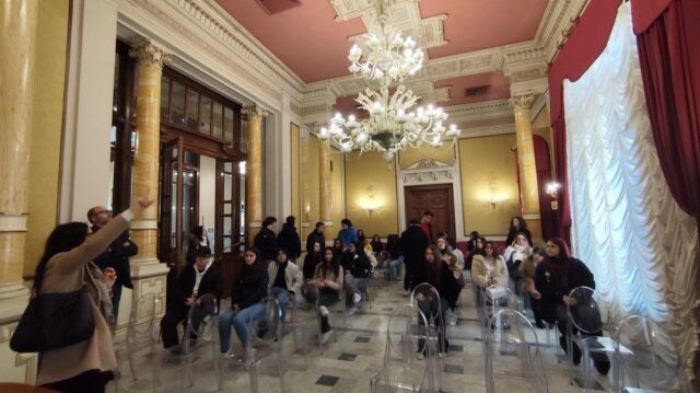L’Aula Consiliare “On. Pietro Battaglia” è stata la prima tappa di un percorso, ormai solito, che comprende anche il Salone dei Lampadari “Italo Falcomatà” e l’Ufficio di Presidenza.