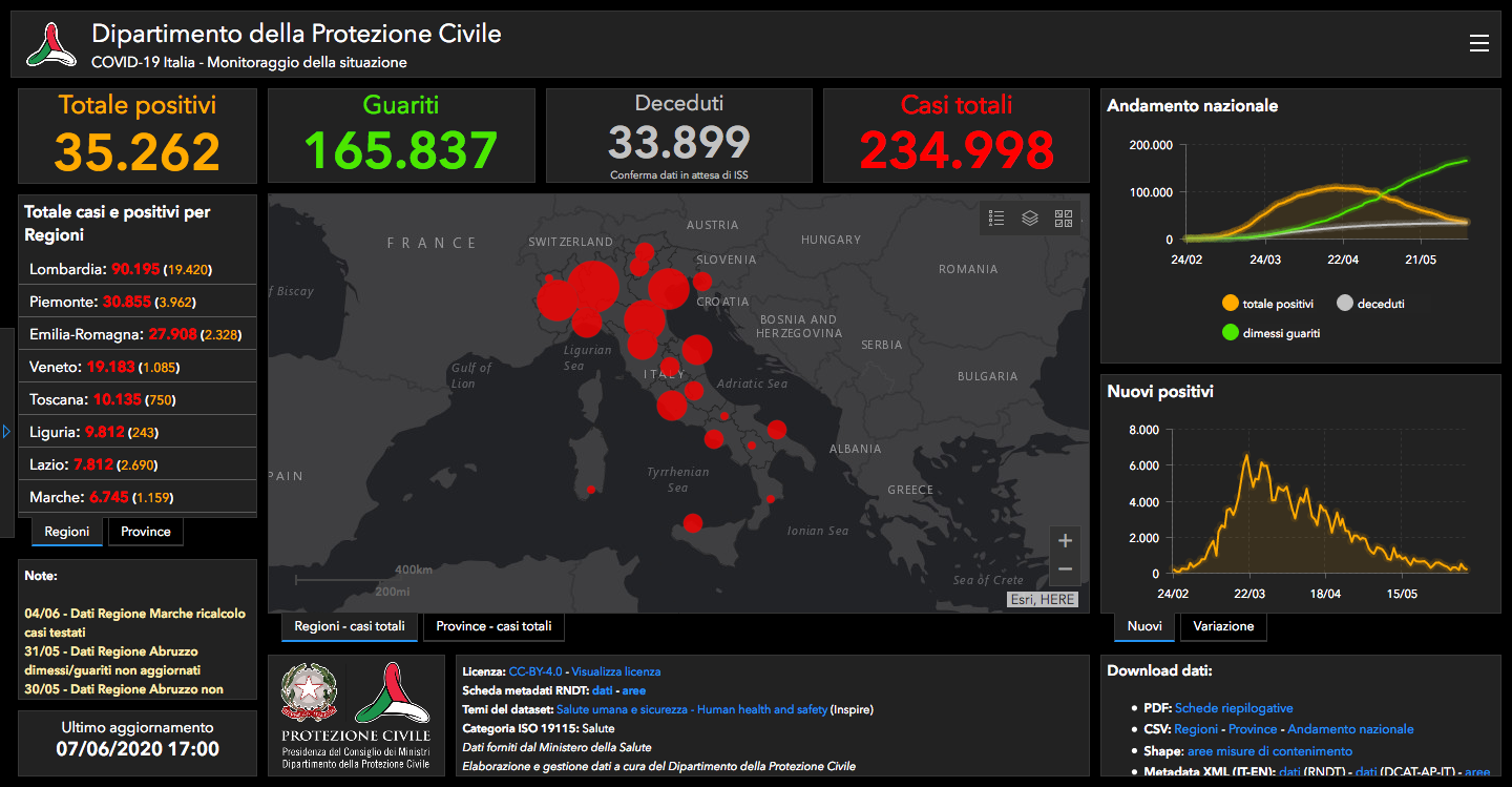 In particolare, nell’ambito del monitoraggio sanitario relativo alla diffusione del Coronavirus sul nostro territorio, a oggi, 7 giugno, il totale delle persone che hanno contratto il virus è di 234.998, con un incremento rispetto a ieri di 197 nuovi casi.