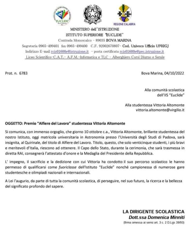 «E’ con orgoglio – affermano in una nota Versace e Quartuccio – che celebriamo il successo della giovane Vittoria Altomonte, tra i 25 studenti italiani meritevoli dell’alto riconoscimento e vanto dell’intero territorio reggino. Già studentessa dell’Iis “Euclide” di Bova Marina, in più occasioni finalista di prestigiosi premi di Astronomia grazie al suo costante impegno ed alla guida del Planetario Pythagoras, e oggi brillante studentessa in Astronomia all’Università degli Studi di Padova, Vittoria esprime la meglio gioventù della nostra terra».