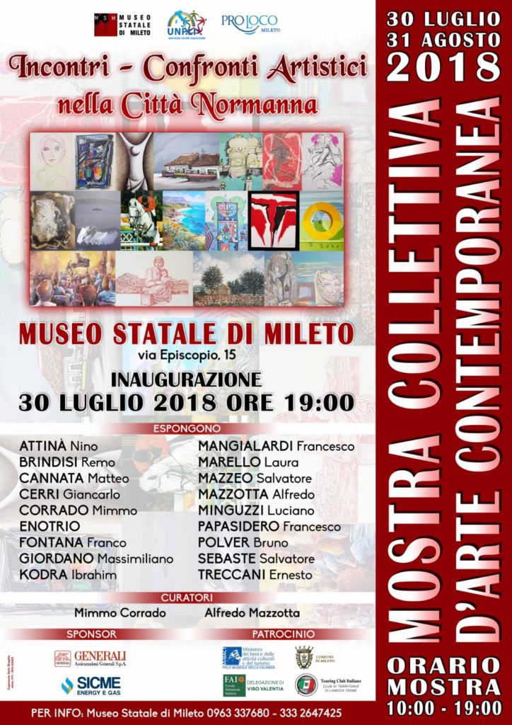 (516) Lunedì 30 luglio 2018, alle ore 19.00, nel cortile del Museo Statale di Mileto, si terrà l’inaugurazione della mostra collettiva d’arte contemporanea dal titolo Incontri – confronti artistici nella città normanna. Interverranno: Angela Acordon, direttore del Polo Museale della Calabria; Faustino Nigrelli, direttore del Museo Statale di Mileto; S. E. mons. Luigi Renzo, vescovo della diocesi di Mileto – Nicotera – Tropea; Rosa Mazzeo, sindaco di Mileto e i curatori della mostra collettiva Mimmo Corrado e Alfredo Mazzotta. Questi, di seguito indicati, gli artisti che esporranno nella prestigiosa rassegna: Attinà Nino; Brindisi Remo; Cannata Matteo; Cerri Giancarlo; Corrado Mimmo; Enotrio; Fontana Franco; Giordano Massimiliano; Kodra Ibrahim; Mangialardi Francesco; Marello Laura; Mazzeo Salvatore; Mazzotta Alfredo; Minguzzi Luciano; Papasidero Francesco; Polver Bruno; Sebaste Salvatore e Treccani Ernesto. Il Museo Statale di Mileto, diretto da Faustino Nigrelli, afferisce al Polo Museale della Calabria guidato da Angela Acordon.