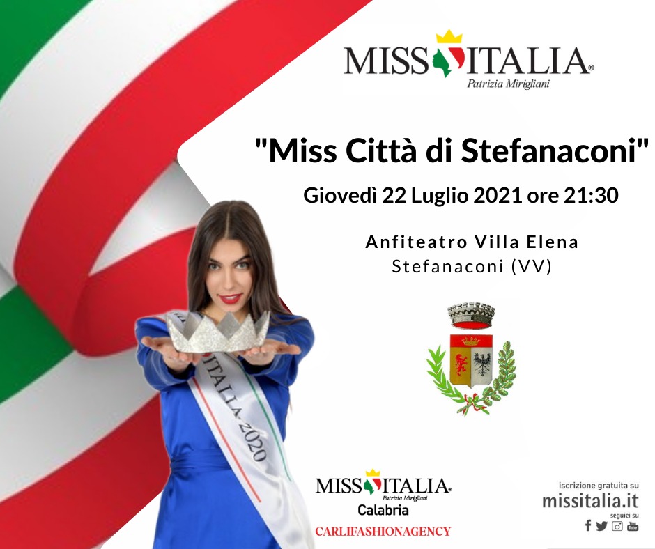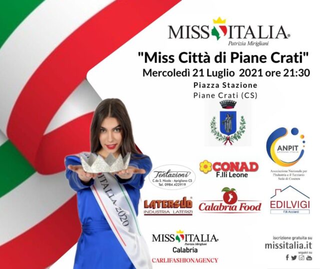 (20) La CarliFashionAgency di Linda Suriano e Carmelo Ambrogio, agenzia esclusivista del concorso Miss Italia Calabria per il settimo anno consecutivo, accenderà i riflettori su Piane Crati mercoledì 21 luglio, e Stefanaconi giovedì 22 luglio 2021. “Vogliamo porgere un grande ringraziamento alle amministrazioni comunali di Piane Crati e Stefanaconi le quali” – dichiarano gli agenti regionali – “hanno così fortemente voluto il realizzarsi della manifestazione”. Alla conduzione degli eventi si alterneranno Larissa Volpentesta e Andrea De Iacovo, assieme a Linda Suriano, arricchiti dalle immancabili coreografie del corpo di ballo di Lia Molinaro e dall’esibizione di artisti e talenti calabresi. Dopo l’elezione di Miss Città di Dipignano che ha registrato la presenza di Miss Italia 2020 Martina Sambucini, sarà la città di Vincenzo Lepiane, tra gli altri illustri nomi pianoti, ad ospitare l’evento nella Piazza Stazione, dove verrà eletta Miss Città di Piane Crati.