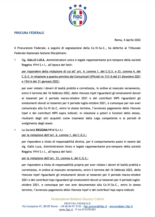 E’ arrivato il legittimo ed atteso deferimento per Luca Gallo e la Reggina rei, il primo quale Amministratore unico e la seconda per responsabilità diretta per il comportamento posto in essere dal suo presidente, di non aver versato le ritenute IRPEF riguardanti gli emolumenti dovuti ai tesserati per il periodo marzo-ottobre 2021 e dei contributi INPS riguardanti gli emolumenti dovuti ai tesserati per il periodo luglio-ottobre 2021.