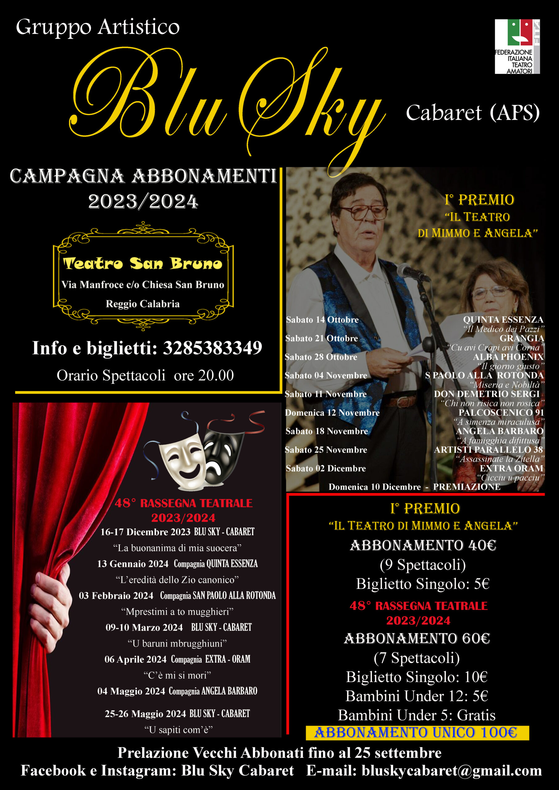 La pausa estiva ha invece visto i ragazzi del Blu Sky cabaret girare diverse piazze della provincia Reggina prima di buttarsi a capofitto in una nuova fantastica avventura ossia il 1° premio “Il Teatro di Mimmo ed Angela” di cui abbiamo già parlato in precedenza.
