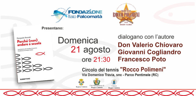 L’appuntamento, promosso appunto dalla Fondazione in collaborazione con il Circolo del Tennis, è patrocinato dal Comune di Reggio Calabria, dalla Città Metropolitana e dalla Regione Calabria. Dopo l’introduzione della Presidente della Fondazione, Professoressa Rosa Neto Falcomatà, dialogheranno con l’autore, Pierpaolo Perretti, tre autorevoli personalità del mondo della scuola e dell’educazione: Don Valerio Chiovaro, Protopapa della Parrocchia della Cattolica dei Greci, giornalista, docente e fondatore dell’Associazione Attendiamoci Onlus, da sempre impegnata nel sociale in particolare per l’educazione dei più giovani; Giovanni Cogliandro, Dirigente Scolastico e Vicepresidente dell’Associazione Nazionale Presidi di Roma, Docente Universitario, autore di diverse pubblicazioni dedicate al mondo della scuola; Francesco Poto, linguista, storico docente nei licei scientifici reggini e Presidente dell’Istituto di Ricerca Accademica Sociale ed Educativa.