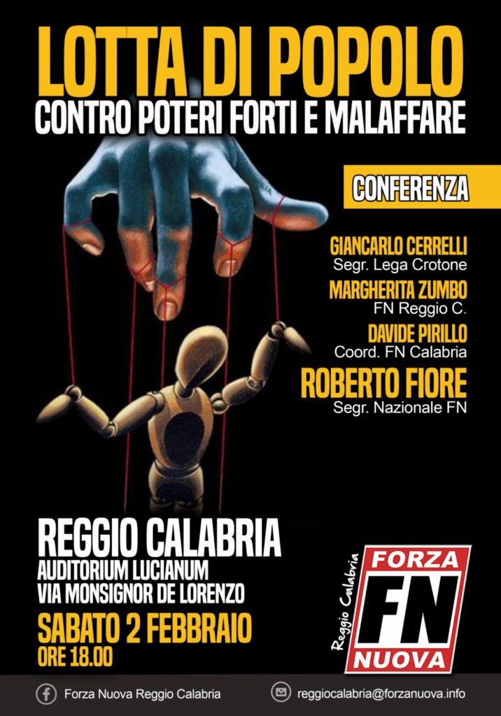 (90) “Sabato 2 alle ore 18, presso l’auditorium Lucianum di Reggio Calabria (sito in via Monsignor De Lorenzo), si terrà una conferenza dal titolo “Lotta di popolo; contro poteri forti e malaffare“.
