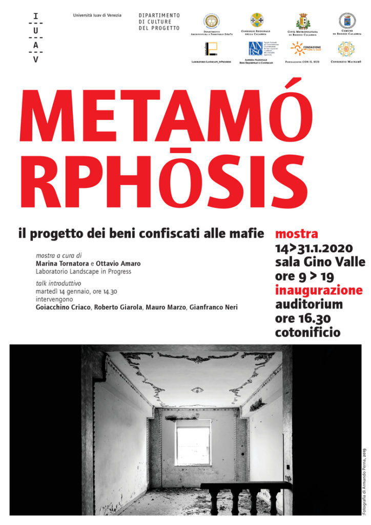 (4) Nell’ambito del programma “Call mostre spazio Gino Valle” dell’Università IUAV di Venezia, il Laboratorio di ricerca Landscape_inProgress del Dipartimento Architettura e Territorio dArTe dell’Università Mediterranea di Reggio Calabria, curerà la mostra “METAMORPHOSIS. Il progetto dei Beni Confiscati alle Mafie”, 14 -31 Gennaio 2020