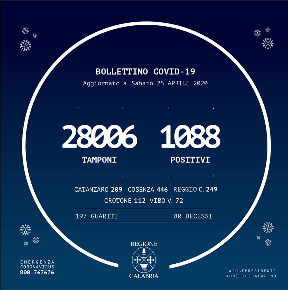 (108) In Calabria ad oggi sono stati effettuati 28.006 tamponi. Le persone risultate positive al Coronavirus sono 1.088 (+9 rispetto a ieri), quelle negative sono 26.918.