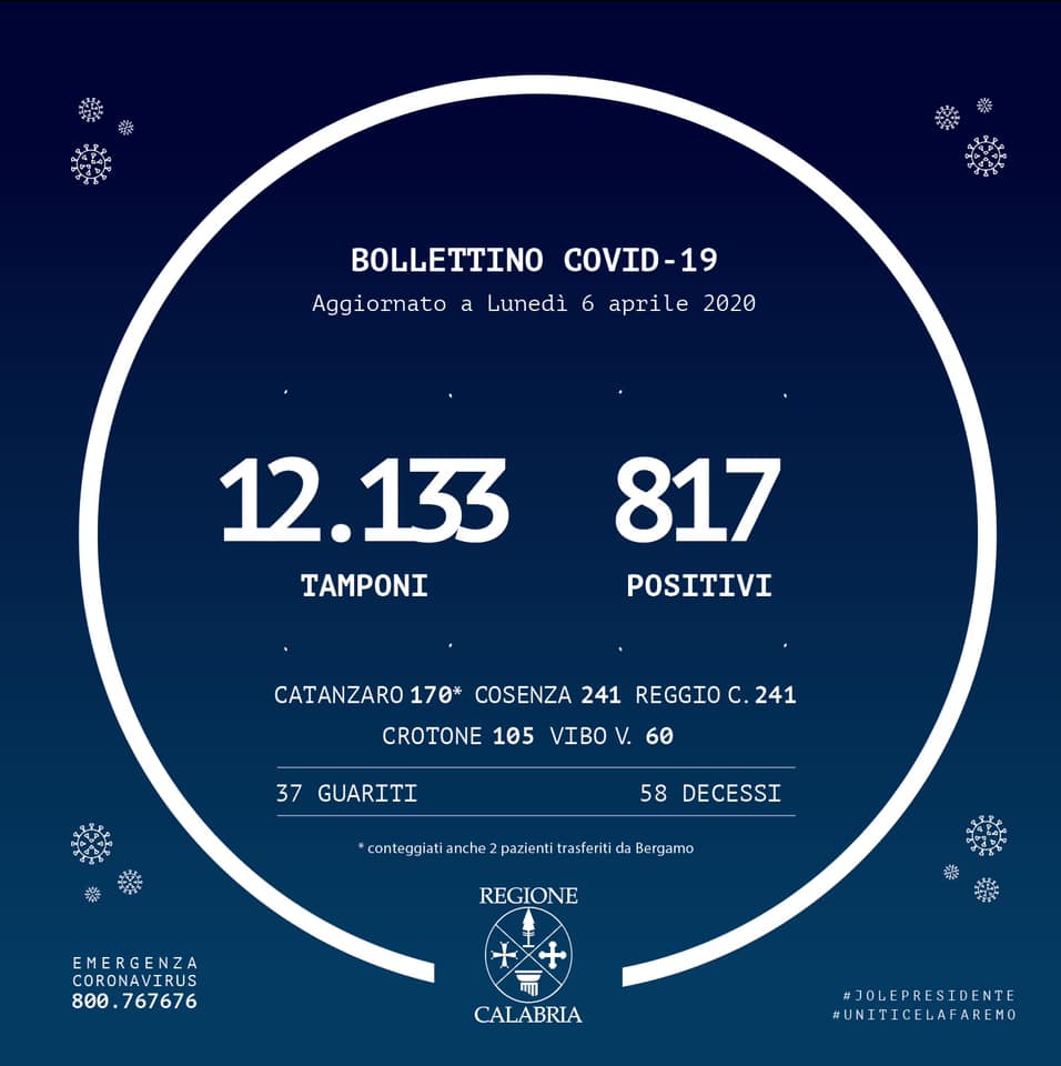 Nel conteggio sono compresi anche i due pazienti di Bergamo trasferiti a Catanzaro, mentre non sono compresi i numeri del contagio pervenuti dopo la comunicazione dei dati alla Protezione Civile Nazionale.