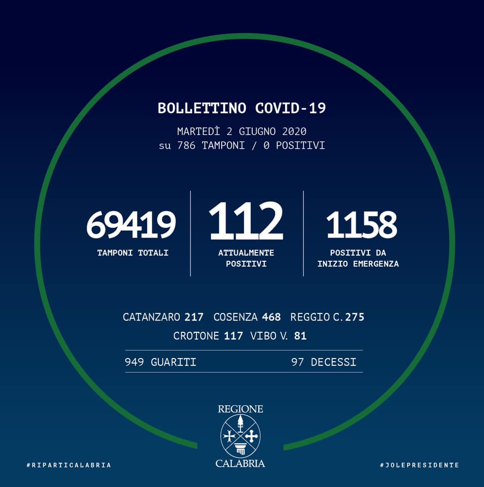 (277) In Calabria ad oggi sono stati effettuati 69.419 tamponi. Le persone risultate positive al Coronavirus sono 1.158 (+0 rispetto a ieri), quelle negative sono 68.261.