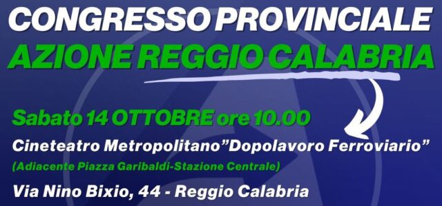 Azione Reggio Calabria scalda i motori per il suo congresso provinciale. Sabato 14 ottobre alle ore 10.00 al Cineteatro Metropolitano, ex Dopolavoro Ferroviario, in piazza Garibaldi, si terrà la massima assise provinciale del partito di Carlo Calenda.
